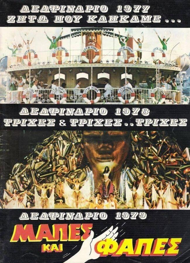 Το παρακάτω σκαναρισμένο πρόγραμμα (που έχω φυλάξει από τότε) έχει στο εξώφυλλό του φωτογραφίες από τις παραστάσεις του 1977 και του 1978 στο Δελφινάριο, ωστόσο είναι το πρόγραμμα της παράστασης του 1979 «Μάπες και φάπες».